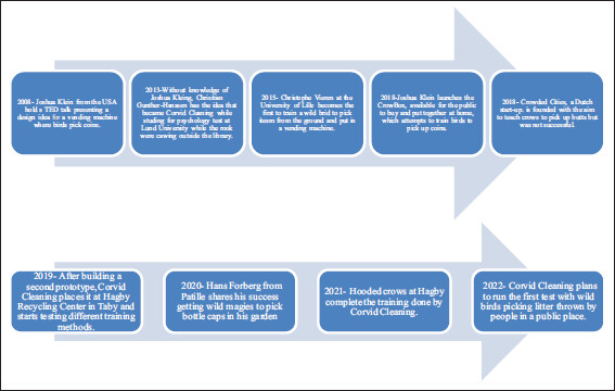 Before Corvid Cleaning began working in 2022, various individuals, organizations and countries have experimented in using birds to collect litter, with the first documented occurrences in 2008. However, none of the prior attempts have been successful. Corvid Cleaning is the first company to shape this innovative idea. A timeline of the Corvid Cleaning project is shown in Figure 1.